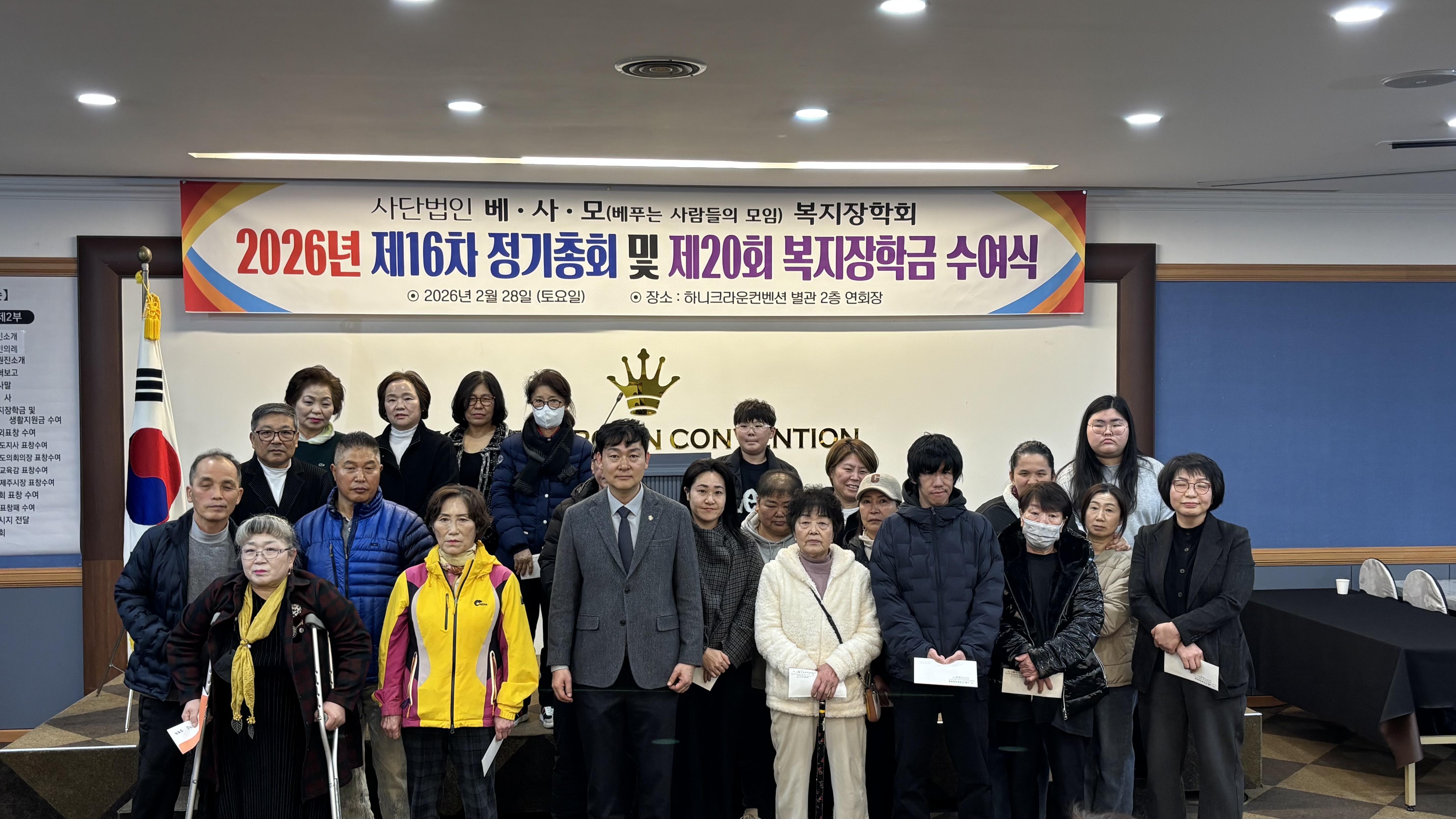2026년 2월 28(토요일)에 본 회 제16차 정기총회 및 제20회 복지장학금 수여식 개최에 많은 성원과 격려를 보내주신 덕택에 성공리에 진행될 수 있어 대단히 감사드립니다.