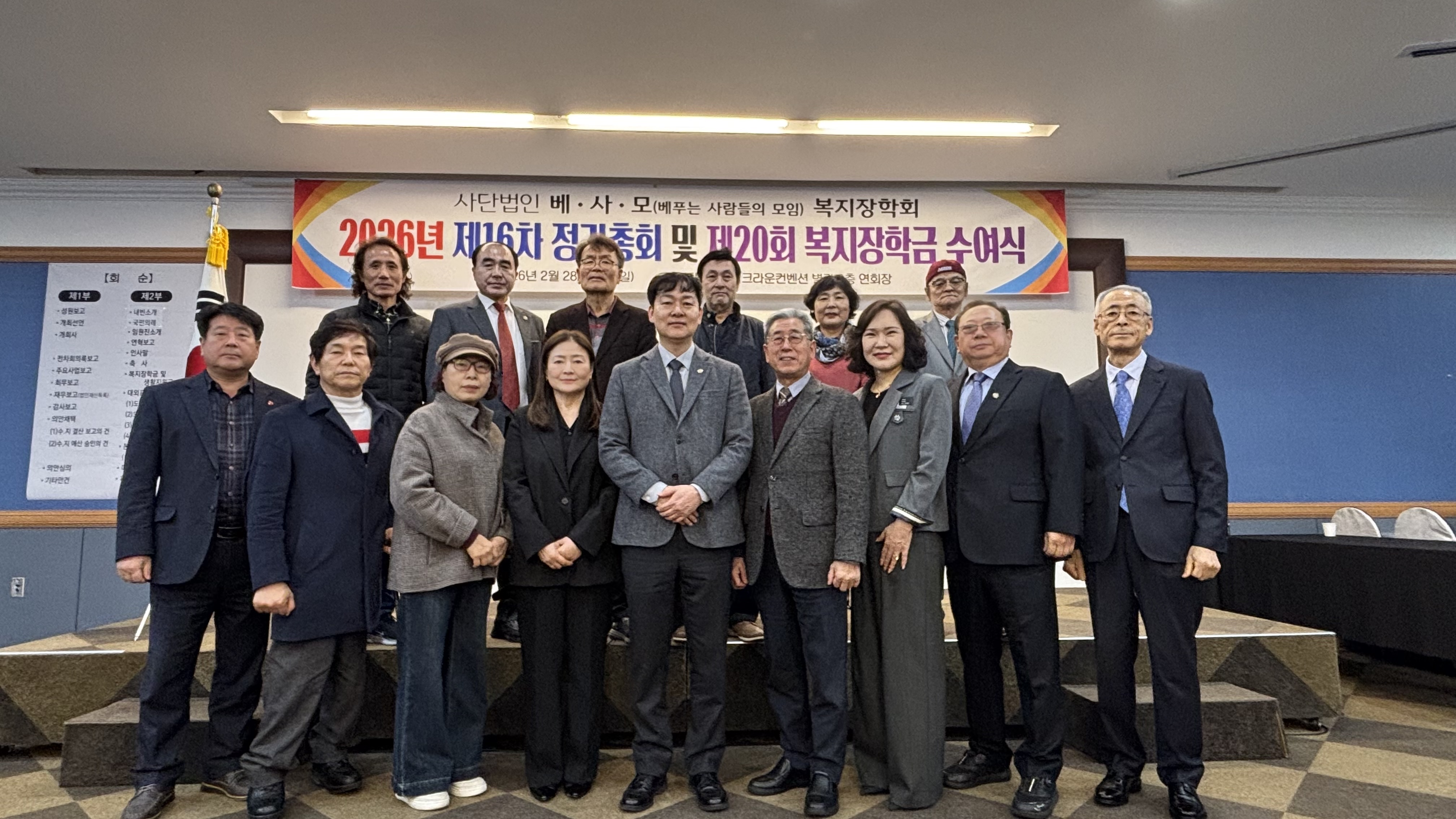 2026년 2월 28일(토요일)에 본 회 제16차 정기총회 및 제20회 복지장학금 수여식 개최에 많은 성원과 격려를 보내주신 덕택에 성공리에 진행될 수 있어 대단히 감사드립니다.