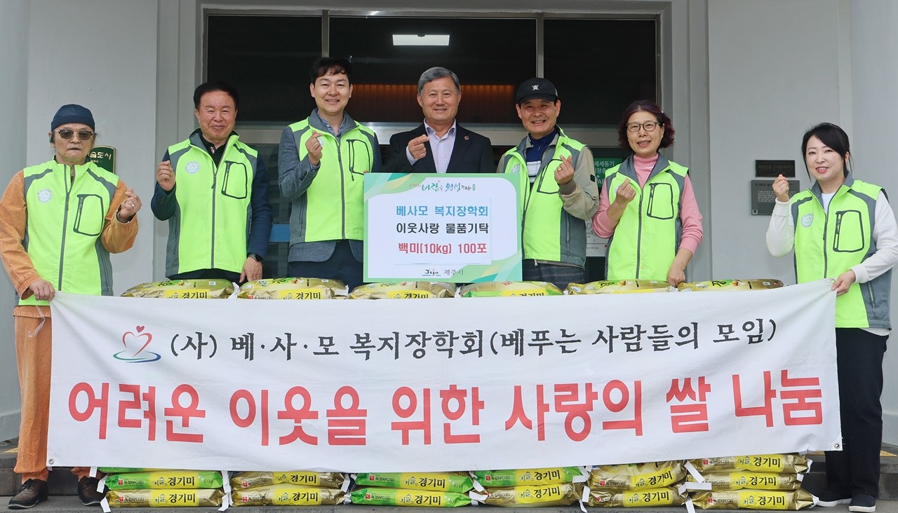 (사)베사모 복지장학회(이사장 양창영, 이하 베사모)는 20일 10kg 쌀 100포(450만원 상당)를 제주시청에 기탁했다.
